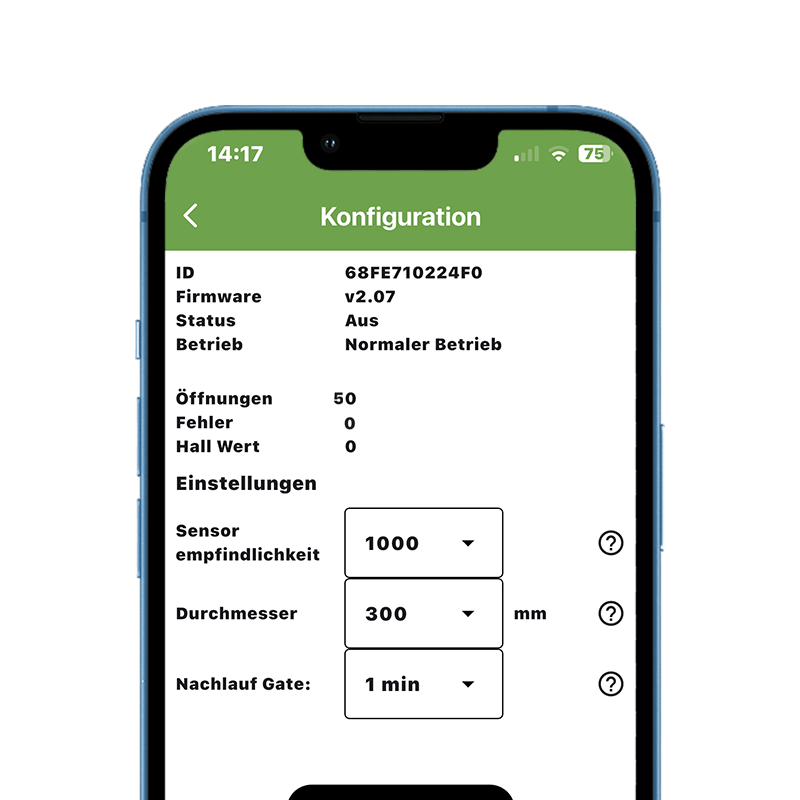 Verwenden Sie die SHUTR Connect App, um den Sensor zu konfigurieren. Stellen Sie den Durchmesser des EP-Schieber, die Sensorempfindlichkeit und die Nachlaufzeit ein.