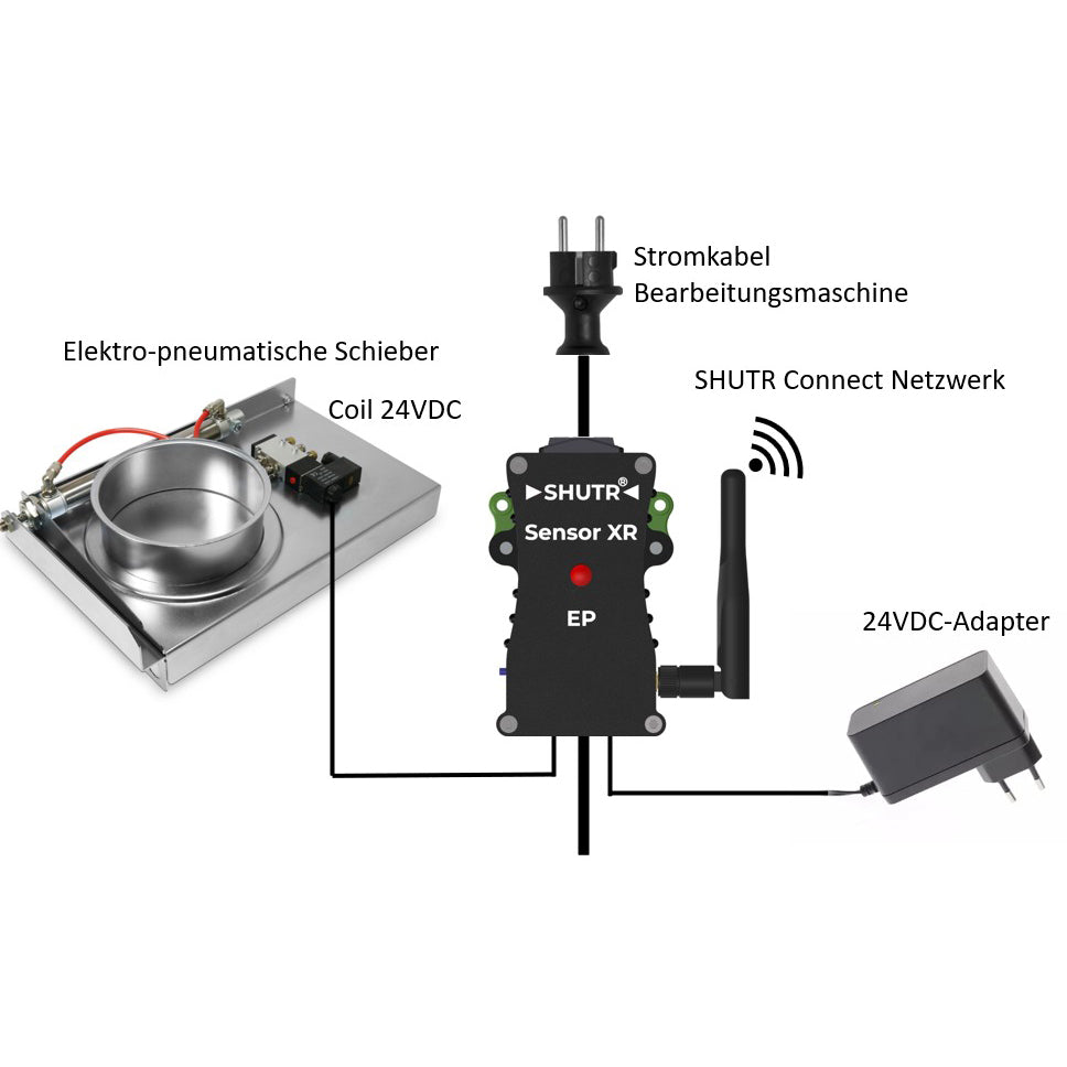 Der Sensor wird am Stromkabel einer Verarbeitungsmaschine befestigt und erkennt, ob die Maschine eingeschaltet ist. Bei Aktivierung kann der Sensor XR/EP direkt einen elektropneumatischen Schieber (24V DC-Spule) steuern. Die Empfindlichkeit lässt sich über die SHUTR Connect App einstellen. Siehe die Sensor+-Option für den Anschluss von bis zu 4 Schieber. Für mehr als 4 Schieber und/oder wenn Sie den Absauger steuern möchten, benötigen Sie einen SHUTR Controller. Eine externe Antenne sorgt für eine verbesserte Reichweite von bis zu 100 Metern. Stromversorgung erfolgt über ein kleines 24VDC-Netzteil zur Wandmontage mit einem 4 Meter langen Kabel (im Lieferumfang enthalten).