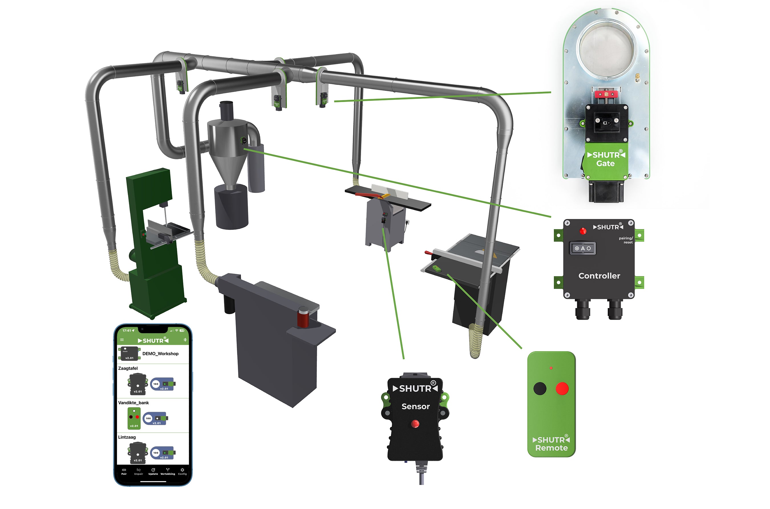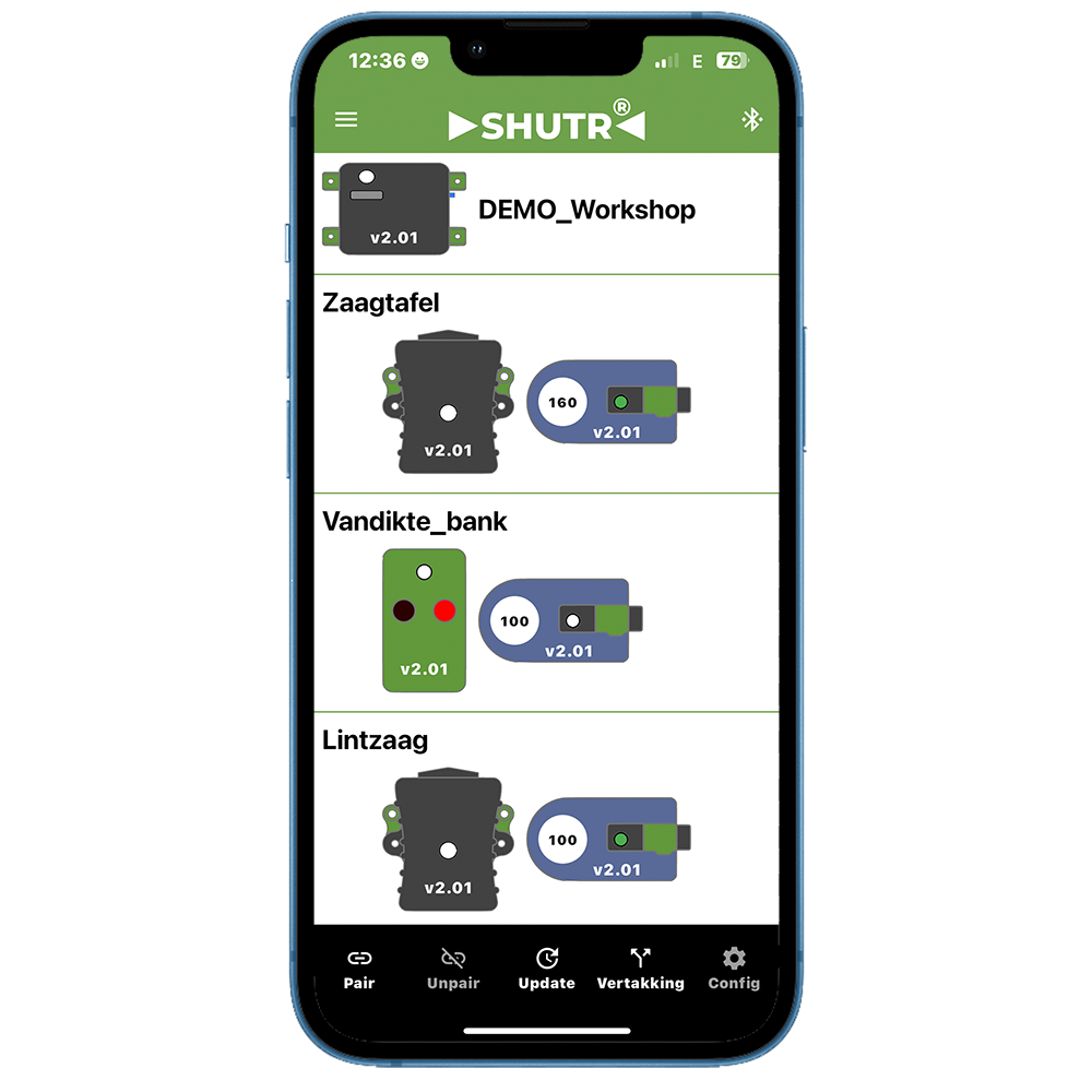 Eenvoudige en flexibele installatie, geen netwerkkabels en geen persluchtleidingen nodig. En met de SHUTR Connect app kan iedereen het systeem makkelijk en snel configureren